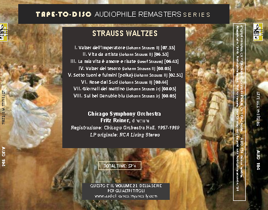 Allegato al n. 194 Strauss - Valzer e Polka Fritz Reiner - Chicago Symphony Orchestra I - Valzer dell'Imperatore op.437 [Johann Strauss] (07.35) II - Vita da Artista op.316 [Johann Strauss] (06.53) III - La mia Vita è Amore e Risate op 263 [Joseph Strauss] (06.43) IV - Valzer del Tesoro op.418 [Johann Strauss] (08.05) V - Sotto Tuoni e Fulmini op.324 - polka - [Johann Strauss II] (02.41) VI - Rose del Sud Op.388 [Johann Strauss II] (08.44) VII - Giornali del Mattino op.279 [Johann Strauss jr] (08.05) VIII - Sul bel Danubio blu op.314 [Johann Strauss jr] (08.05)